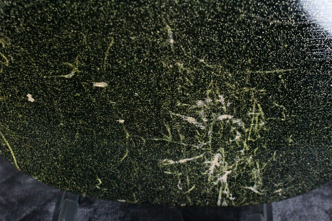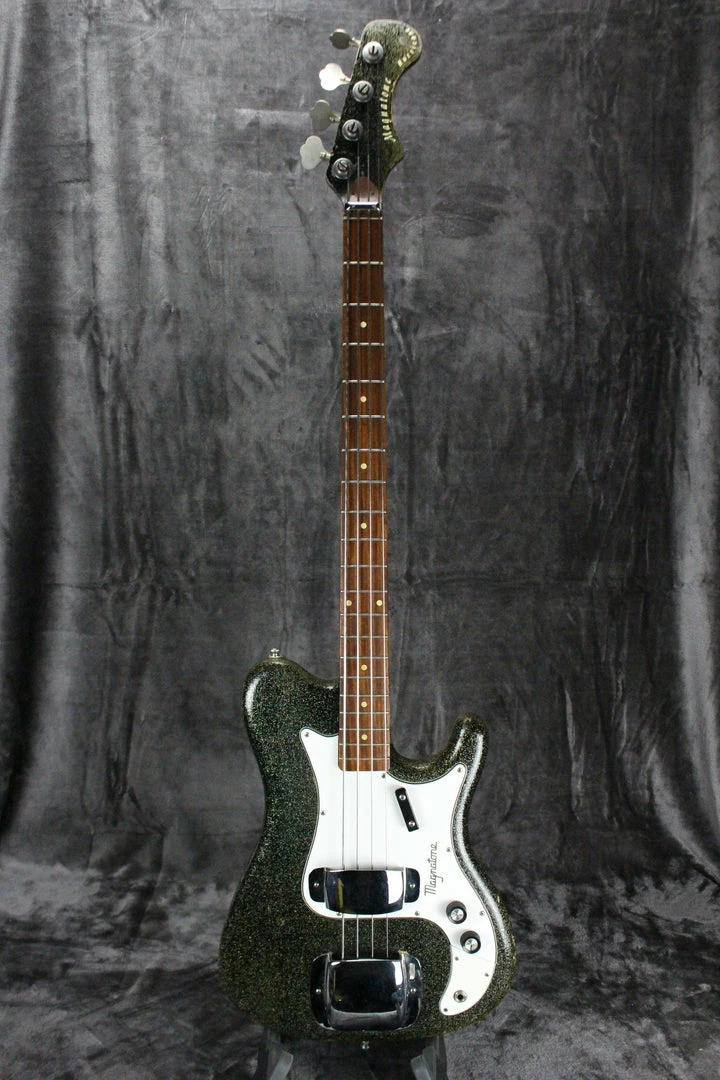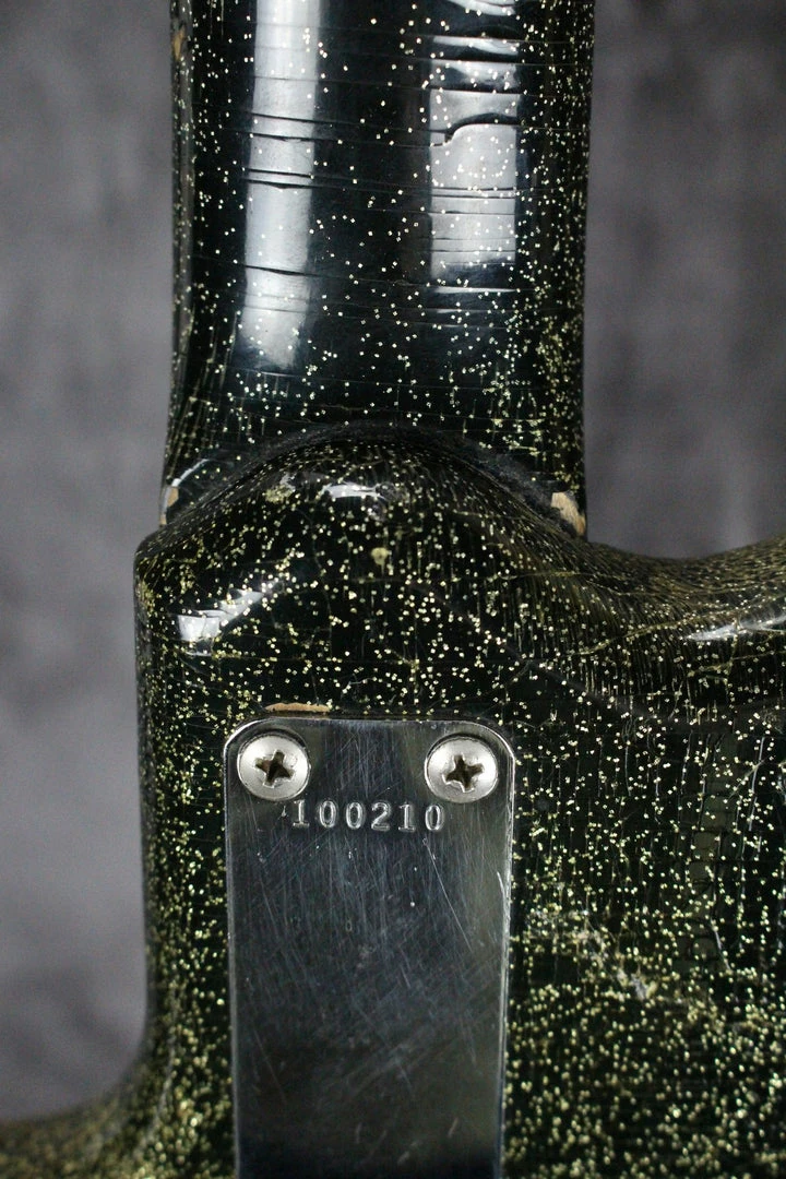 Body: Solid single-cutaway body in a black & gold sparkle finish. Chrome tailpiece with four saddles, a thumbwheel for the string mute system (non-functioning) and a chrome tailpiece cover. 3-ply white pickguard with Magnatone logo, dual plastic control knobs, a thumb rest and pickup cover.
