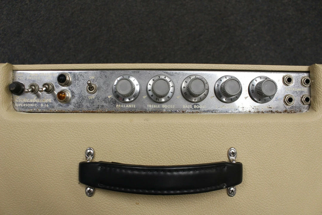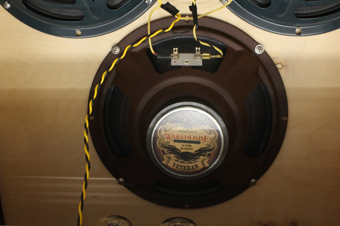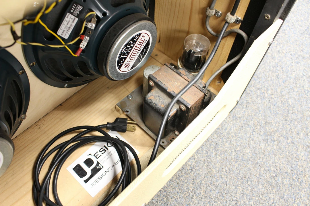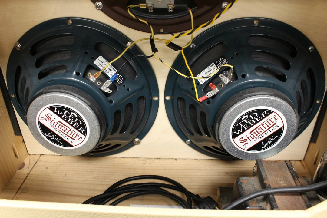 This amp has been tested. It works and sounds great. It has been rehoused in a new cabinet that looks beautiful. It has one American Vintage Warehouse speaker and two Ted Weber Signature speakers. All of the speakers are 10″.