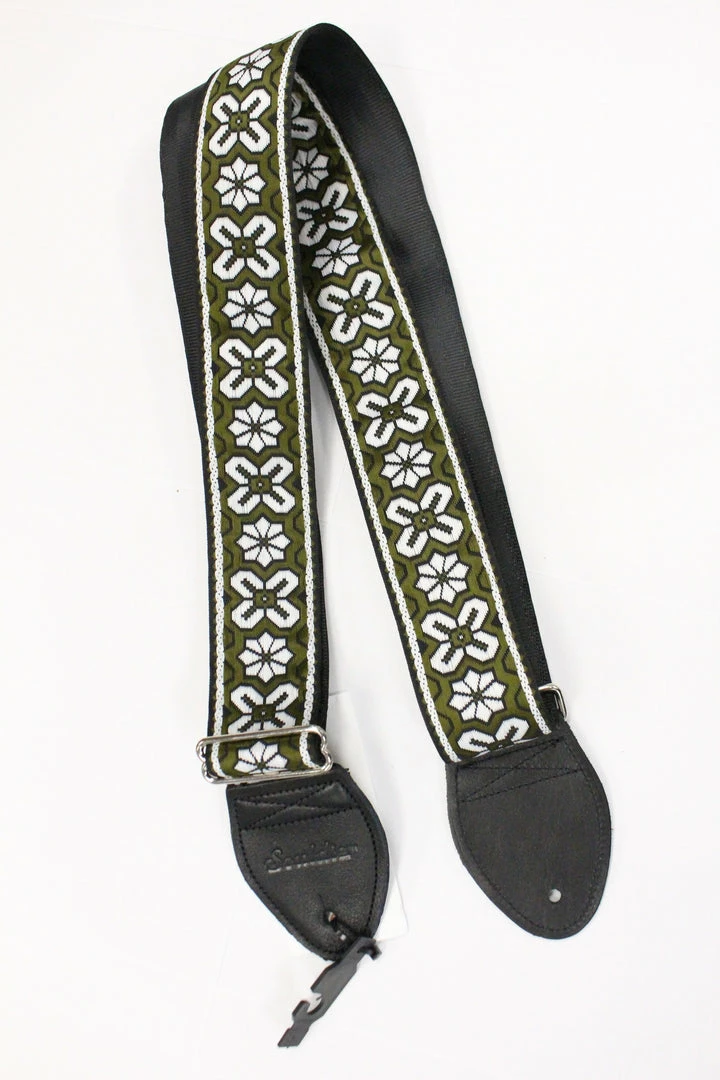 This is a new Souldier Custom Guitar Strap with the Greenwich Olive Drab design and black leather ends